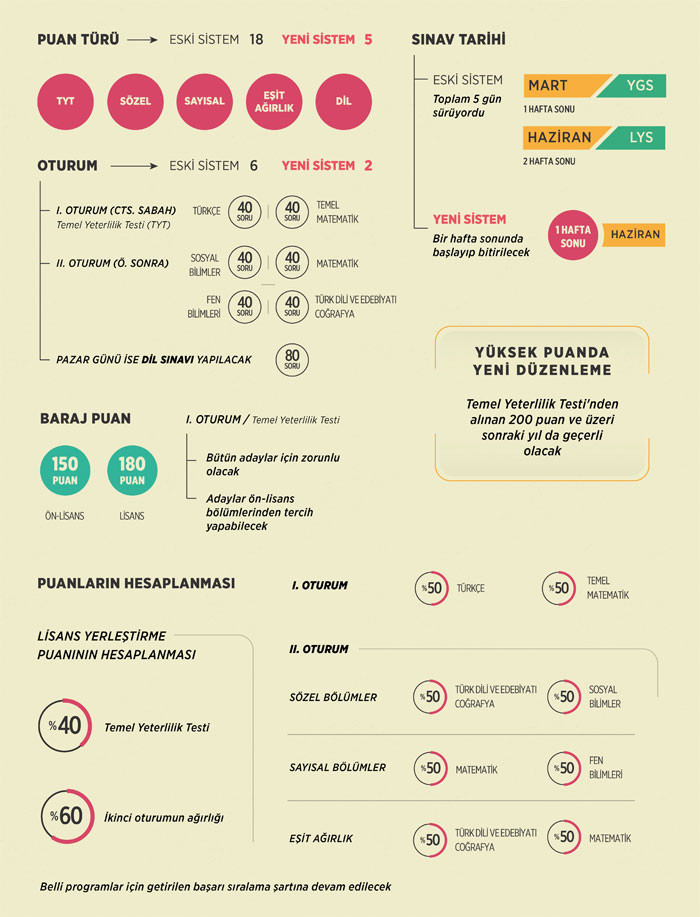 - Lisans puan türünde ise 4 puan türü esas alınacak. Sözel sayısal eşit ağırlık ve dil. Temel yeterlilik testinin ağırlığı yüzde 40 olacaktır.