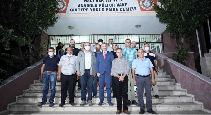 Hacı Bektaşi Veli Anadolu Kültür Vakfı Genel Başkanı Ercan Geçmez ve Gültepe Yunus Emre Cemevi’ndeki canlarla sohbet eden Başkan Büyükakın, Muharrem orucu iftarı vesilesiyle kendilerini ağırlayan canlara teşekkür etti. Başkan Büyükakın, kendilerini konuk etmekten büyük mutluluk duyduklarını dile getiren Gültepe Yunus Emre Cemevi yetkilileriyle günün anısına çektirdiği hatıra fotoğrafının ardından ziyaretini tamamladı.