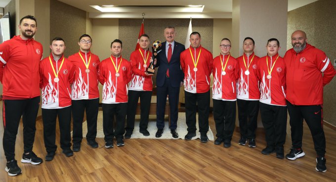 Marmara Belediyeler Birliği ve Kocaeli Büyükşehir Belediye Başkanı Doç. Dr. Tahir Büyükakın, Peru’da yapılan Down Sendromlular Dünya Şampiyonası’nda üçüncülüğü elden Futsal Milli Takımı sporcularını makamında konuk etti. Milli takım sporcuları ve yetkililer ise gerek Avrupa Şampiyonasına gerekse Dünya Kupasına hazırlık aşamalarında Başkan Büyükakın’ın verdiği destekler için teşekkür etti. Kazandıkları kupayı başkan Büyükakın’a getiren milli takım sporcularının mutluluğuna ortak olan Başkan Büyükakın, “Sizleri tebrik ediyorum. İnşallah gelecekte çok daha güzel başlarılar elde edeceksiniz. Bizler sizin yanınızdayız ve desteklerimiz artarak devam edecek” ifadelerini sarf etti.