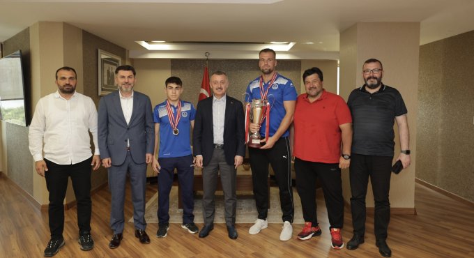 Kocaeli Büyükşehir Belediye Başkanı Tahir Büyükakın, 662. Tarihi Kırkpınar Yağlı Güreşleri’nde başarı elde eden Kağıtspor’un başarılı pehlivanlarını makamında ağırladı. Kırkpınar’da başpehlivanlık boyunda üçüncü olan Büyükşehir Kağıtsporlu Hüseyin Gümüşalan ile teşvik 2 boyunda ikinci olan Mustafa Ekin’i misafir eden Başkan Büyükakın, “Sizleri gönülden tebrik ediyorum. Er meydanında başarılar elde edip şehrimizin adını tüm Türkiye’ye duyurdunuz. Başarıların arkasında yer alan görünmeyen kahramanlar olan antrenörlerimizi de özellikle tebrik etmek istiyorum. Hüseyin bu sene başpehlivanlıkta çok iyi mücadeleler ortaya koydu. İnşallah seneye altın kemeri Kocaeli’ne getireceğine inancım tam. Daha iyi başarılar elde etmeniz için her türlü desteği vermeye hazırız. Ben inanıyorum ki Mustafa kardeşim de gelecek yıllarda çok daha iyi başarılar elde ederek Hüseyin abisi gibi altın kemer için mücadele edecek. Ata sporumuz olan yağlı güreşlerde sizlere canı gönülden başarılar diliyorum” dedi.