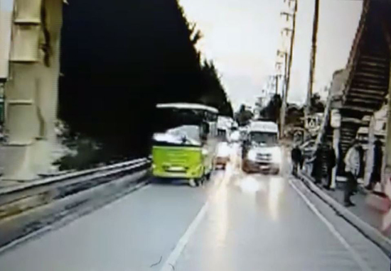 Kaza, sabah saatlerinde, Derince'ye bağlı İbn-i Sina Mahallesi İstiklal Caddesi'nde meydana geldi. Yolun karşısına geçmek isteyen kişi, sürücüsünün hatalı sollama yaptığı minibüse yandan çarparak, yere düştü. Yola savrulan kişi, hemen toparlanarak, ayağa kalktı. Kısa süre minibüs sürücüsüyle tartışan kişi, ardından yoluna devam etti. Kaza anı ise sürücüsünün bölgedeki duraktan yolcu aldığı özel halk otobüsünün güvenlik kamerasınca kaydedildi. Görüntülerde, sollamanın yasak olduğu caddede minibüs sürücüsünün hatalı sollama yaptığı ve yolun karşısına geçen yayanın araca çarptığı anlar yer aldı.