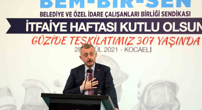 Marmara Belediyeler Birliği ve Kocaeli Büyükşehir Belediye Başkanı Doç. Dr. Tahir Büyükakın, Bem-Bir-Sen’in İtfaiye Haftası kutlamasına katılarak bir konuşma gerçekleştirdi. İtfaiye Teşkilatının kuruluşunun 307’nci yılı nedeniyle yapılan kutlamaya Bem-Bir-Sen Genel Başkanı Levent Uslu, Başiskele Belediye Başkanı Yasin Özlü, İtfaiye Daire Başkanı Doğan Kara, Hizmet-İş Sendikası Kocaeli Şube Başkanı İdris Ersoy, Memur-Sen’e bağlı sendikaların şube başkanları katıldı. Kocaeli İtfaiyesinin kendilerinin yüz akı olduğunu söyleyen Başkan Büyükakın, “11 yılda 14 bin 337 insanımızı boğulmaktan kurtardık. Sahillerimizde verdiğimiz cankurtaranlık hizmetimizle yine sadece bu yıl bin 695 vatandaşımızın boğulmasının önüne geçtik. Kocaeli İtfaiyesi, Türkiye’ye örnektir” dedi.