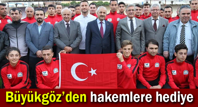 Başkan Büyükgöz’ün elinden eşofmanlarını alan halem ve gözlemciler desteklerinden Başkan Zinnur Büyükgöz’e hakem ve gözlemcilerde TFF logolu tisört hediye ederek teşekkür ettiler.
