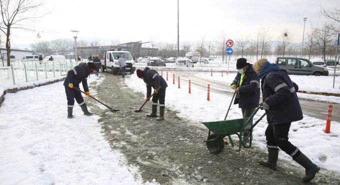 Kar yağışının ardından vatandaşların olumsuz bir durum yaşamaması için Kocaeli Büyükşehir Belediyesi, ekipleri seferber ederek tüm bölgelerde çalışmalarını sürdürüyor. Park ve Bahçeler Dairesi Başkanlığı ekipleri dün gece etkili olan buzlanma nedeniyle vatandaşların kaymaya karşı oluşabilecek kazaların önüne geçmek için gece ayrı sabahın erken saatlerinde ise ayrı ekiple çalışmalara başladı.