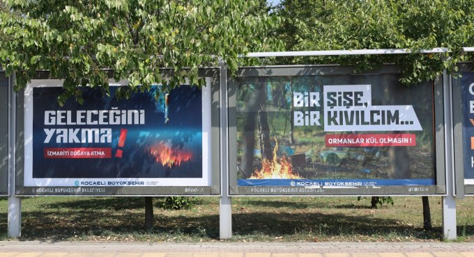 Kocaeli Büyükşehir Belediyesi’nin sosyal medya hesaplarından yayımlanan ve büyük beğeni alan çevre temalı görseller, açık hava mecralarında da yer alıyor. Kocaeli'nin farklı noktalarında konumlandırılan billboardlar, her biri ayrı çevre mesajı taşıyan görsellerle donatıldı. Bu görseller; kontrolsüz ateşlerin yol açabileceği felaketlere, cam ve şişe atıklarının orman yangınlarına neden olma riskine dikkat çekiyor.