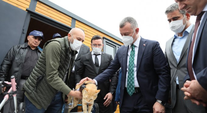 Konuşmasının ardından Başkan Büyükakın, ilçe belediye başkanları ve hayvan severler Patilik Mutlu Sokak Hayvanları Kasabası'nı gezerek incelemede bulundu. Başkan Büyükakın, geçtiğimiz hafta bir aracın altında kalan ve yürüteç takılan bir kediyi severek elleriyle mama yedirdi.