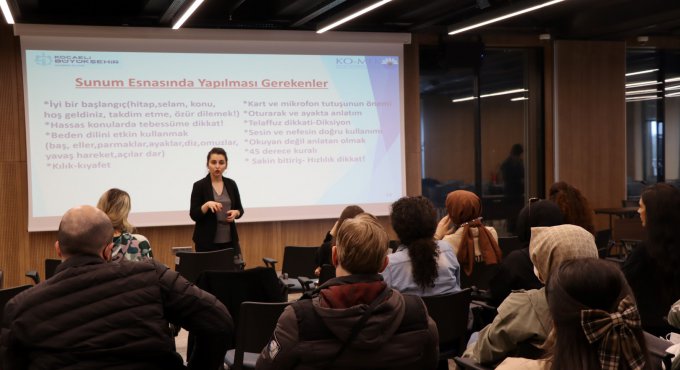 Sunum teknikleri hitabet ve sahne becerileri alanında verilen eğitimde, sahnede sunum teknikleri ve sahnede etkili sunum yapmanın incelikleri anlatılırken, sahnede sunum yaparken beden dilinin ve ses tonunun kararlı olması gerektiğine de vurgu yapıldı.