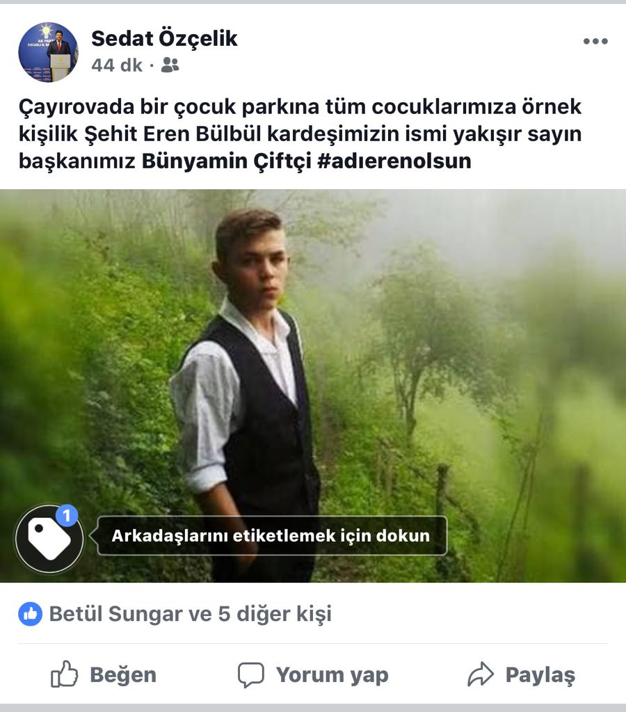 Bilindiği üzere 11 Ağustos 2017'de teröristlerin saklandığı yeri askerlerimize gösterirken şehit düşen Eren Bülbül'ün acısı tüm Türkiye'yi derinden sarsmıştı. Şehidimizin anısını Çayırova'da yaşatmak isteyen bir grup genç ise sosyal medyada bir girişim başlattı. Çayırova Belediye Başkanı Bünyamin Çiftçi'ye çağrıda bulunan gençler, "Çayırova'da bir çocuk parkına tüm çocuklarımza örnek kişilik Şehit Eren Bülbül kardeşimizin adı yakışır sayın başkanımız" diyerek #AdıErenolsun hastag'ini açtılar. Açılan bu hastag kısa sürede Çayırova'da popüler hale geldi.