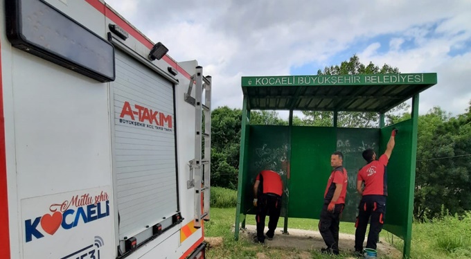 Kocaeli Büyükşehir Belediyesi A Takımı ekipleri, kırsal mahalleler başta olmak üzere, il genelindeki vatandaşların ortak kullanım alanlarında acil yapılması gereken hizmetleri kısa sürede yaparak, mahalleleri güzelleştirmeye devam ediyor. Bu kapsamda, Körfez Sipahiler Mahallesi’ndeki minibüs ve otobüs duraklarına yazılan çirkin yazılar temizlendi, boyanarak güzel bir görünüme kavuşturuldu.