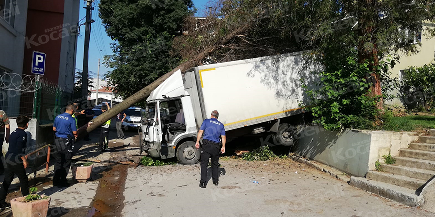 İzmit Santral yokuşunda direksiyon hakimiyetini kaybeden kamyon şoförü ağaçların arasına daldı. Meydana gelen kazada yaralanan olmazken maddi hasar meydana geldi.