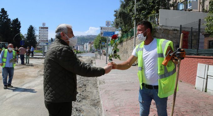 Kocaeli Büyükşehir Belediyesi Genel Sekreteri Balamir Gündoğdu, 1 Mayıs İşçi Bayramı nedeniyle İzmit ilçesinde çalışan belediye personelini ziyaret etti. Çalışmaları inceleyen Genel Sekreter Gündoğdu, işçilerin 1 Mayıs işçi bayramını kutlayıp çiçek takdim etti.