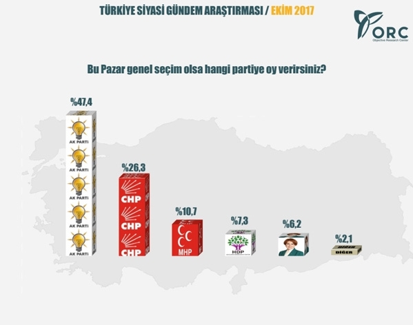 ORC Araştırma Şirketi, 6-8 Ekim tarihleri arasında, 35 ilde toplam 2580 kişi ile ‘‘CATI-Bilgisayar Destekli Telefon Görüşmesi’’ yöntemiyle siyasi nabzı ölçen bir anket çalışması gerçekleştirdi. Ankette, “Bu Pazar genel seçim olsa hangi partiye oy verirsiniz?” sorusuna yanıt arandı. İşte çarpıcı sonuçlar.