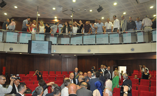 Türk Bayrağı ile yapılan eleştirilere ve AK Partililerin çeşitli konulardaki önergelerine cevap veren Hürriyet, bütün ilçe belediyeleri gibi kendilerinin de ilaçlamalarda sıkıntıları olduğunu, Cedit Kentsel Dönüşüm projesiyle ilgili Büyükşehir Belediyesi ile bu konuda görüşeceklerini belirtti. Mustafa Soydabaş önergeleri konusunda kendisini konuşturmadığı için eleştirilerde bulundu. AK Partiler konuşturulmadıkları gerekçesiyle salondan ayrılırken ortalık bir anda karıştı. CHP ve AK Partililer birbirine girdi. Salonda bulunan izleyiciler de tartışmaya karıştı.