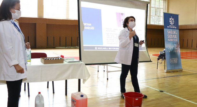 Kocaeli Büyükşehir Belediyesi, tüm dünyayı etkisi altına alan korona virüs salgını tedbirleri kapsamında hijyen eğitimi veriyor. Bu kapsamda Derince İlçe Emniyet Müdürlüğü’nde görevli hizmetli personele eğitim verildi.