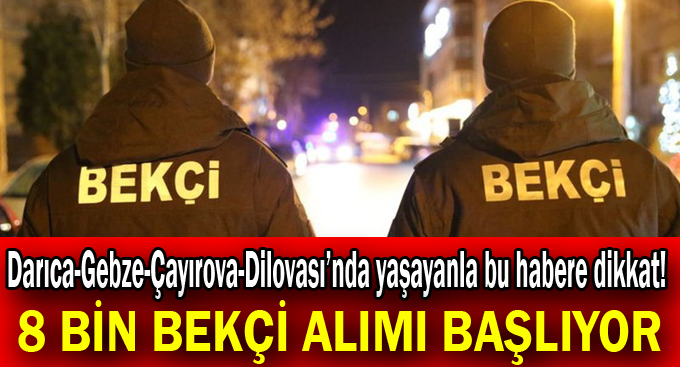 Emniyet Genel Müdürlüğünce, 8 bin bekçi alımına ilişkin başvuru şartları açıklandı. Emniyet Genel Müdürlüğünün internet sitesinden, 8 bin çarşı ve mahalle bekçisi alımına yönelik başvuru şartları ilan edildi. Buna göre, adaylar, 18 Mart-1 Nisan tarihlerinde "www.pa.edu.tr" adresinden e-Devlet şifreleri ile giriş yaparak, ön başvuruda bulunabilecek. Çarşı ve mahalle bekçiliği için adaylarda aranan şartlar ile alıma yönelik ayrıntılı bilgilere, Emniyet Genel Müdürlüğünün ve Polis Akademisi Başkanlığının internet sitesinden ulaşılabilecek.Kocaeli'de ise,300 bekçi alınımı olacak.
