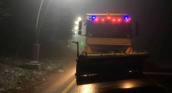 Kocaeli Büyükşehir Belediyesi Karla Mücadele ekipleri, dün gece itibariyle etkisini göstermesi beklenen kar yağışı öncesinde, ilimizin rakımı en yüksek noktası olan Kartepe zirve yolunda nöbetteydi. Muhtemel kar yağışının yolda buzlanmaya sebep olarak araçların kaymasına sebep olmaması için sabaha kadar nöbet tutan ekipler, kentimizin önemli turizm merkezi Kartepe zirve yolunda yol açma ve tuzlama çalışmaları yapmak için bekledi.