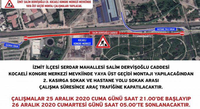 Kocaeli Büyükşehir Belediyesi Salim Dervişoğlu Caddesi’ne inşa ettiği üst geçitlerinin montajına devam ediyor. Bu kapsamda Serdar Mahallesi Salim Dervişoğlu Caddesi Kocaeli Kongre Merkezi mevkiinde 25 Aralık Cuma Günü 21.00 itibariyle montaj çalışması yapılacak. Çalışma süresince Salim Dervişoğlu Caddesinin Kasırga Sokak ve Hastane Yolu Sokak arasından araç geçişine izin verilmeyecek. Çalışmalar 26 Aralık Cumartesi günü 05.00’da son bulacak.