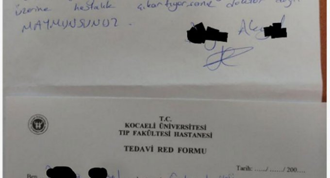 Kocaeli Üniversitesi Tıp Fakültesi Hastanesi’nde bir hastanın yazdıkları büyük tepki çekti. İsmi bilinmeyen bir kişi, hastanenin tedavi red formuna adeta aklına ne gelirse yazdı. Doktorlara ve hastane çalışanlarına ağır hakaretler içeren bu yazı, bir anda sosyal medyanın gündemine oturdu. Doktora beddua eden, onları maymuna benzeten bu yazıyı yazan şahıs ile ilgili yetkililerin soruşturma açması istendi. Özellikle sağlık camiasında büyük tepki çeken bu yazıyı yazan şahsın cezalandırılması isteniyor.