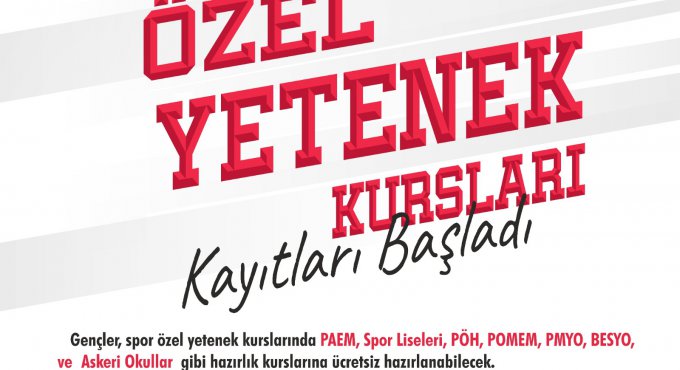 Kocaeli Büyükşehir Belediyesi Gençlik ve Spor Hizmetleri Dairesi Başkanlığı Spor Kenti Kocaeli vizyonuyla Ücretsiz Özel Yetenek Spor Kursları bu sezon da öğrencilerin umudu olmaya devam ediyor. Kovid-19 tedbirleri kapsamında gençler, spor özel yetenek kurslarında PAEM, Spor Liseleri, PÖH, POMEM, PMYO, BESYO, Askeri Okulları ve Görevde Yükselme gibi hazırlık kurslarına ücretsiz hazırlanabilecek.