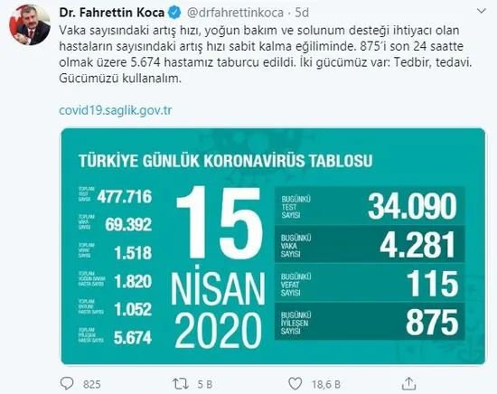 Bakan Koca vakaları açıkladığı paylaşımında, "Vaka sayısındaki artış hızı, yoğun bakım ve solunum desteği ihtiyacı olan hastaların sayısındaki artış hızı sabit kalma eğiliminde. 875'i son 24 saatte olmak üzere 5.674 hastamız taburcu edildi. İki gücümüz var: Tedbir, tedavi. Gücümüzü kullanalım." dedi.
